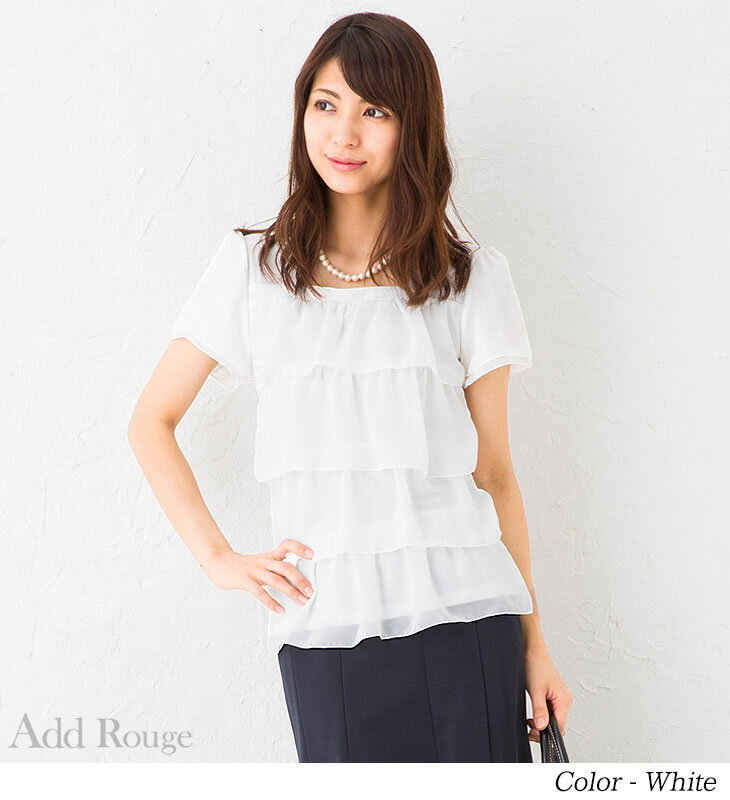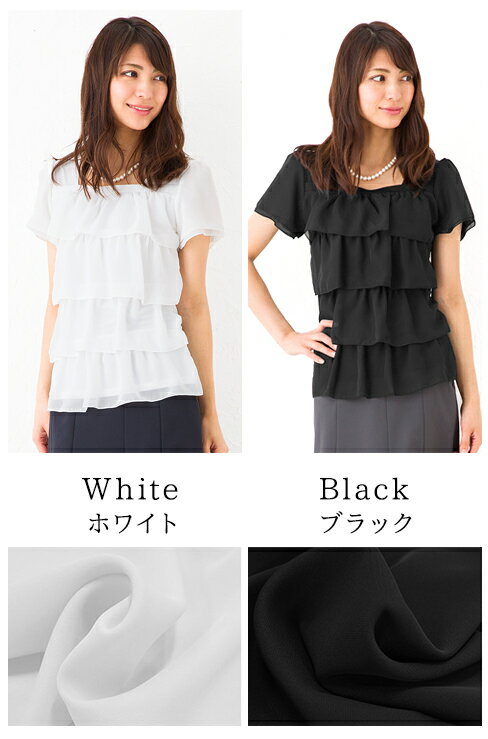 【サイズ】S/M/L/LL/3L/4L 【カラー】ホワイト/ネイビー/ブラック 【トップス分類】[半袖トップス] ▼前面がすべてフリル!でも甘すぎず大人の雰囲気の半袖トップス。