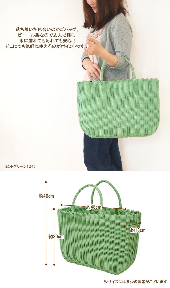 なんでもおまかせビニールのかごバッグ ・Spec 商品名 PPバッグ(ジャンボ) サイズ w約48cm×d約18cm×h約30(持ち手部分含めて46)cm 約480g ※多少のサイズ誤差がございます 素材 ポリプロピレン