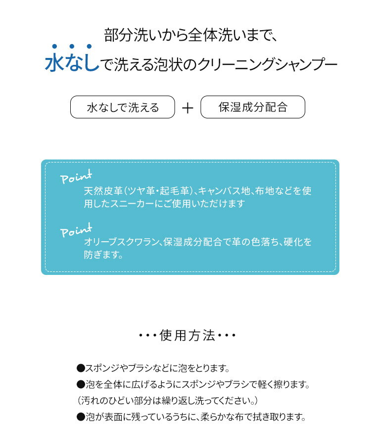 スニーカーの汚れをしっかり落とす! 部分洗いから全体洗いまで、水なしで洗える泡状のクリーニングシャンプーです。